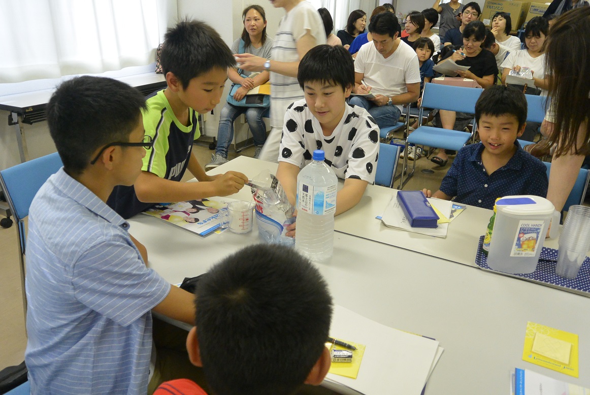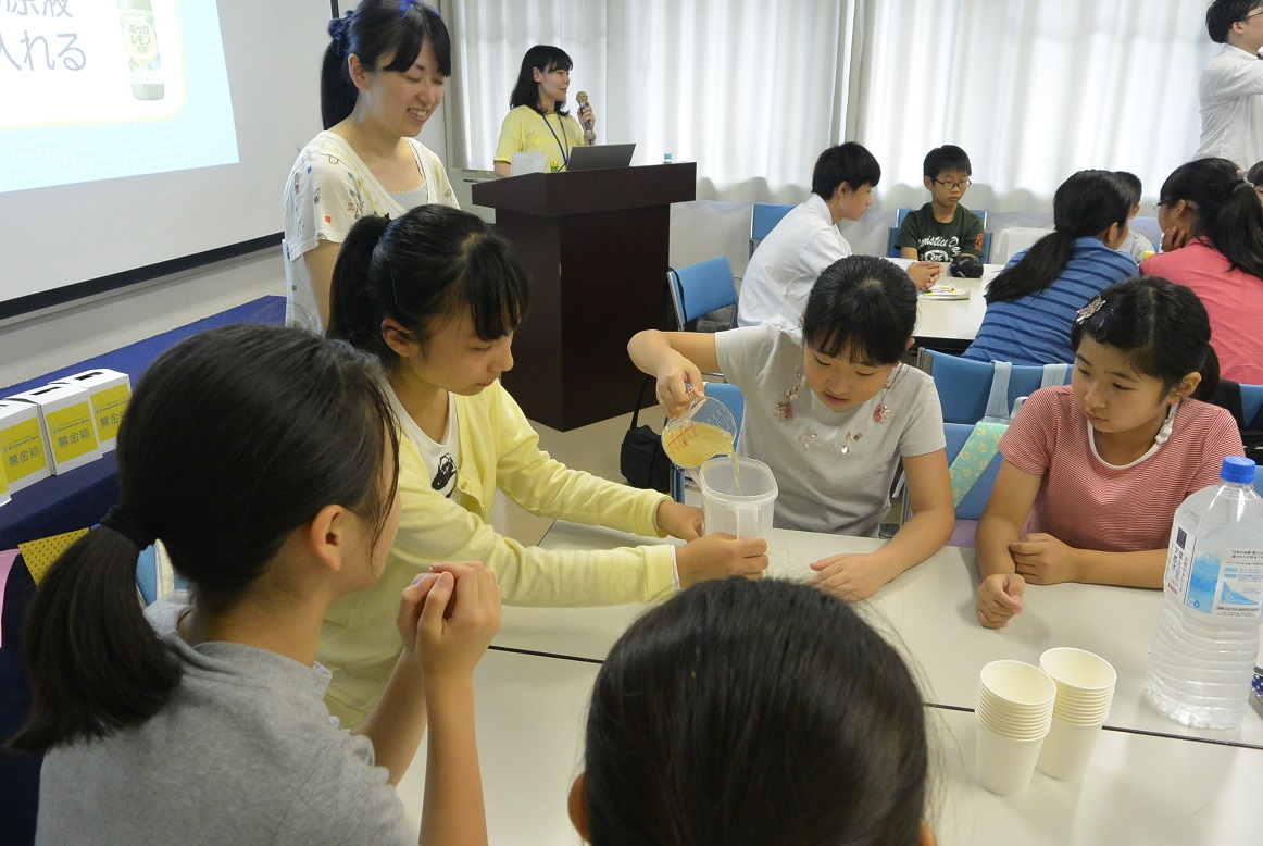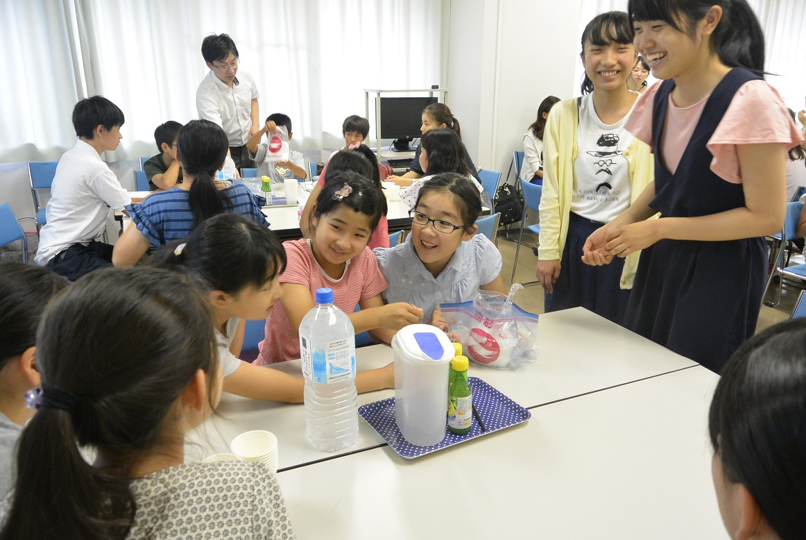 各テーブルで、レモン液、水、お砂糖を混ぜてレモネードを実際に作ってみました!