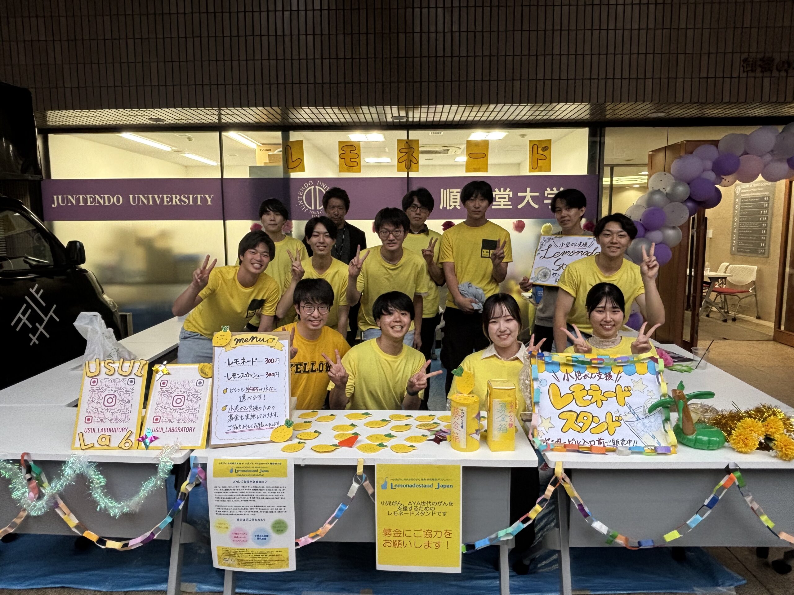 2025年10月11日(土)~12(日)、順天堂大学保健医療学部棟の順天堂大学 学園祭にて、順天堂大学 保健医療学部・保健医療学研究科 臼井研究室の皆さんが小児がん支援のレモネードスタンドを開催くださいました!