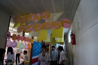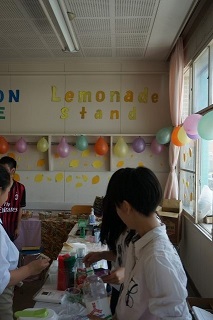 レモネードスタンド会場の教室は、段ボールを切り抜いた「LEMONADE STAND」という看板、画用紙で作ったたくさんのレモン、色とりどりの風船、レモン色の布などで飾りました。また、小児がんのこと、ヘアドネーションやホスピタルクラウンについて調べたことを掲示しました。