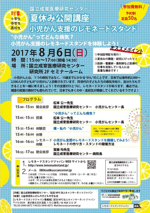 2017年8月6日(日)国立成育医療研究センター 夏休み公開講座~小児がん支援のレモネードスタンド~イベントを開催しました!
