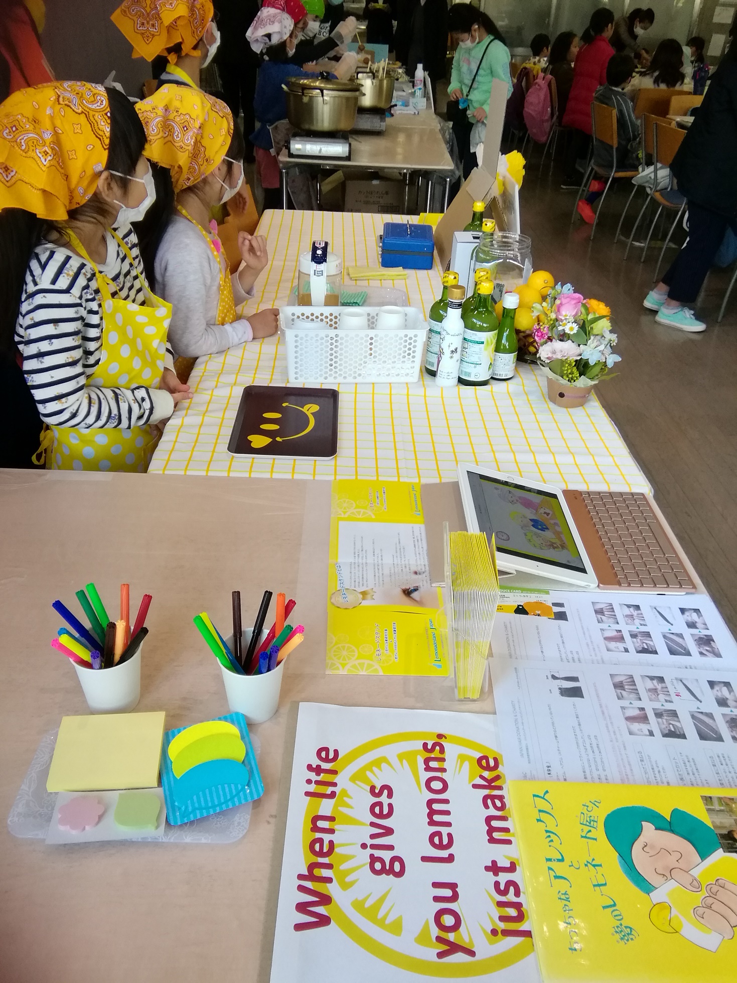5歳~15歳までのお子さま達が参加する「ミニたまゆり」というイベント会場でのレモネードスタンド開催でした。参加した皆さんは、自分たちの力で町を運営します。労働者として働き、賃金を得て、税金を納入して、あまったお金で必要なものや楽しいサービスを消費するという一連の社会を経験できるイベントです。