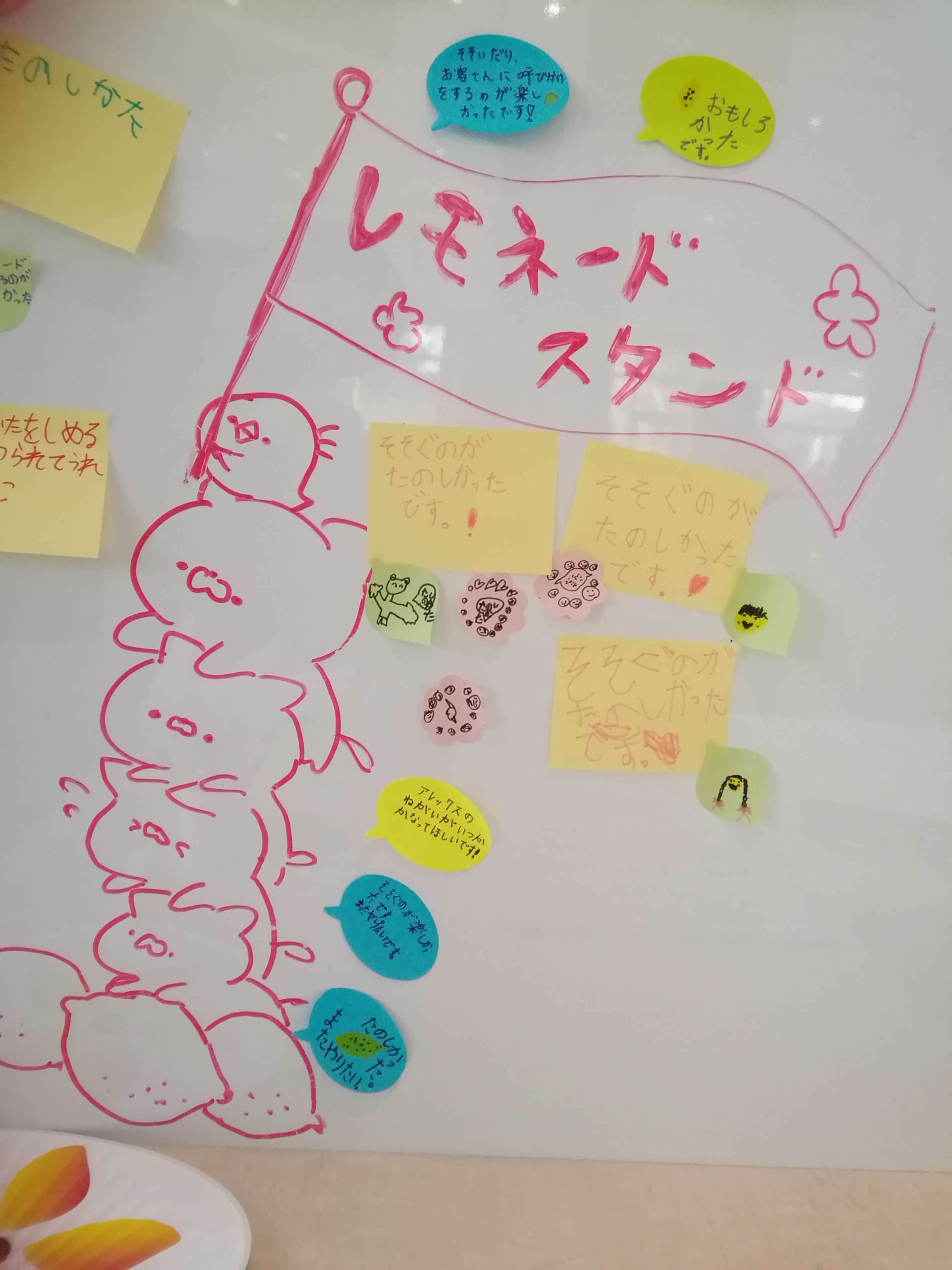 職業体験の一つとしてレモネード販売を選んでくれた子どもたちは、仕事に就く前に、「アレックスのレモネードスタンド」の動画を観ることから始まりました。販売をスタートすると、とても誇らしげに、レモネード販売を呼びかけ、現金を受けとり、レモネードを注ぎ、カップに蓋をして、お客さまにお渡ししてくれました。