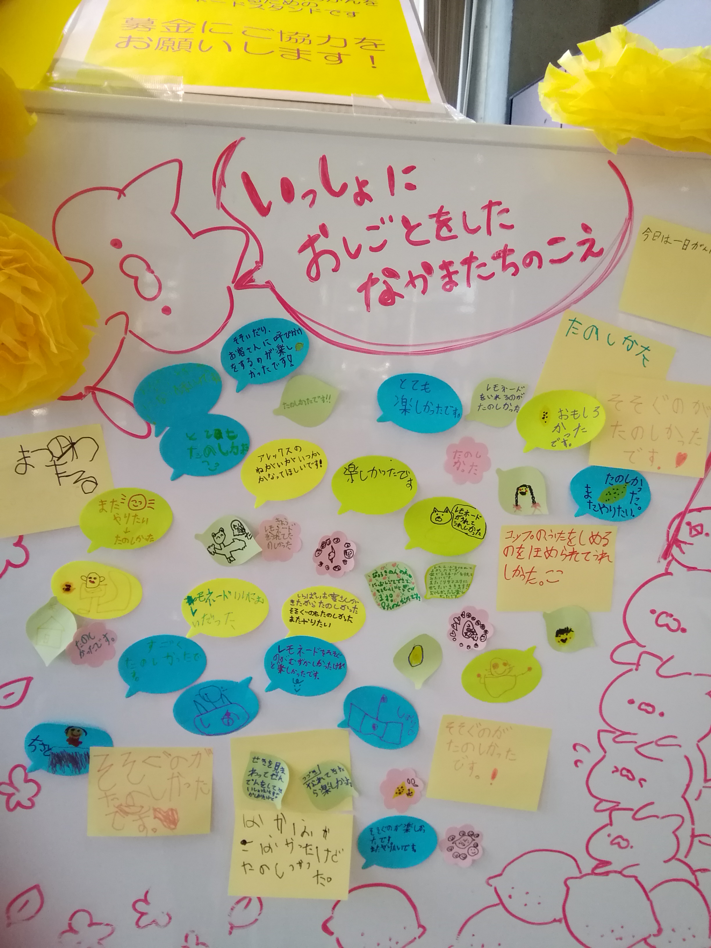 お渡ししたレモネードは60円でしたが、100円玉で支払い、「お釣りはいらないよ」とご寄付いただける方がほとんどでした。販売する労働の楽しみ以上に、人々が社会に貢献する気持ちに触れる機会となったと思います。ありがとうございました。